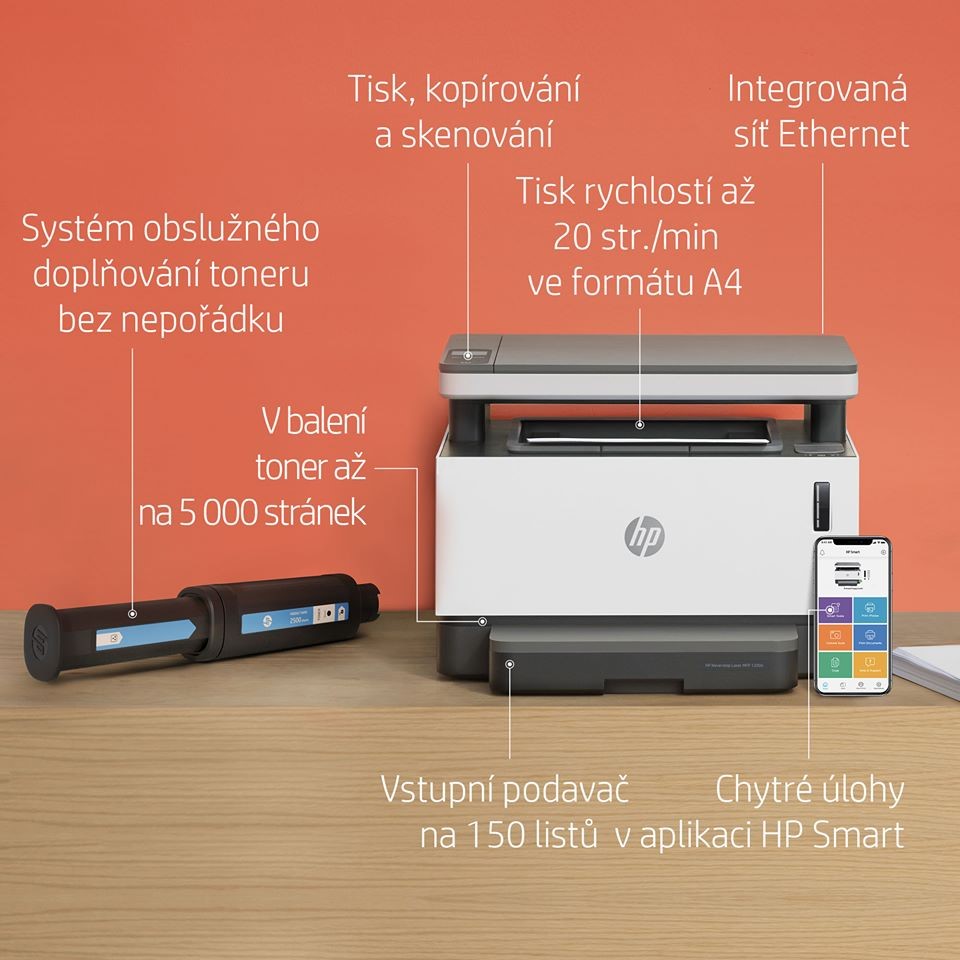 Zcela nový způsob doplnění toneru (tzv. tank systém) umožňuje rychlé a jednoduché „dosypání“ toneru a přináší levný laserový tisk – náplň na přibližně 5000 stran stojí 499 Kč. Připojení jednoduše pomocí WiFi, rychlost tisku 2️0 stránek za minutu a naprostá volnost při tisku – tiskněte, skenujte a kopírujte prakticky odkudkoli s nejlepší aplikací pro mobilní tisk ve své třídě – HP Smart.